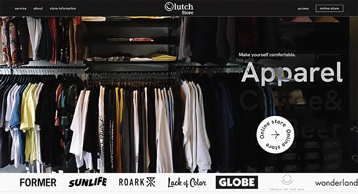 「Apparel」の文字がmix-blend-modeやclip-pathのような手法で色反転していて、背景と文字のコントラストを生む効果的なデザイン。