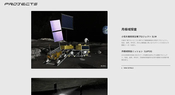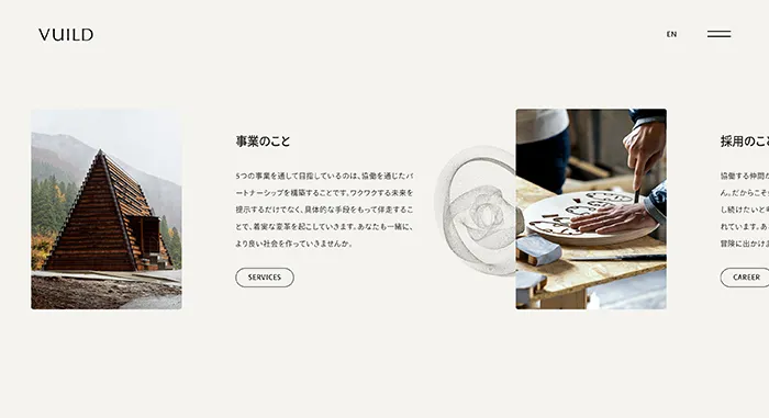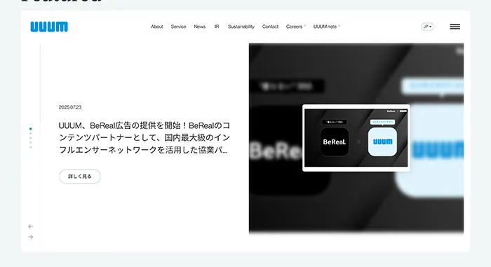 メニューの文字やSNSリンク、スクロール誘導といった補助的なUIのサイズを小さくしており、コンテンツとの間にメリハリを生み出している。