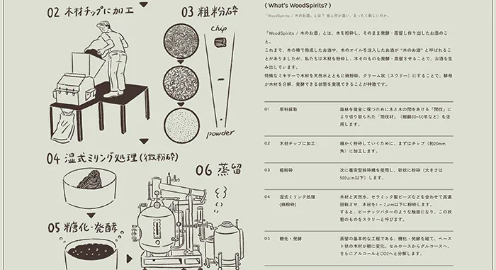 イラストと表を併用し、木からお酒ができるまでのプロセスを非常にわかりやすく表現している。